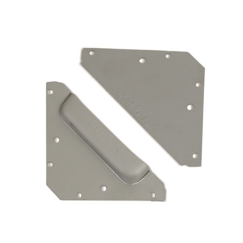 Attached to the upper corner of the frame with a dual function: reinforcing the corner and serving as a hanger