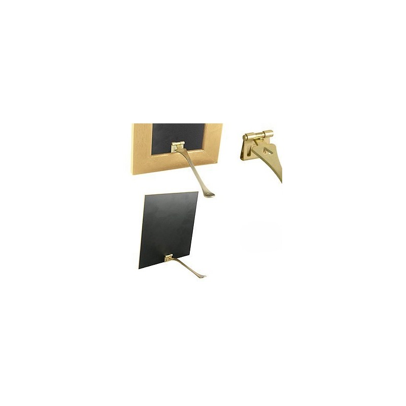 Sistema de apoio para a parte traseira de quadros ou porta-retratos usando um suporte articulado niquelado que se fixa na parte traseira com uma âncora de dobradiça tipo "testa"