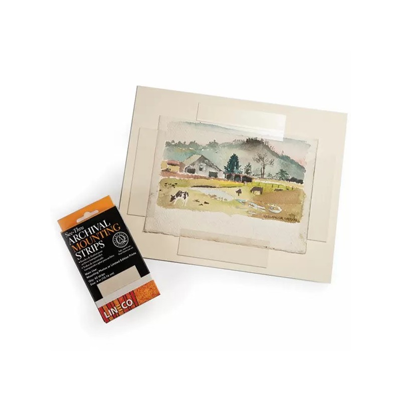 Tiras de montagem para uma instalação segura e sem charneiras de obras de arte em passe-partouts. Resistentes e seguras, as Tiras de Montagem Lineco são feitas de poliéster de qualidade arquivística (Mylar ou Melinex) e papel livre de ácido, com fita adesiva na parte traseira.
