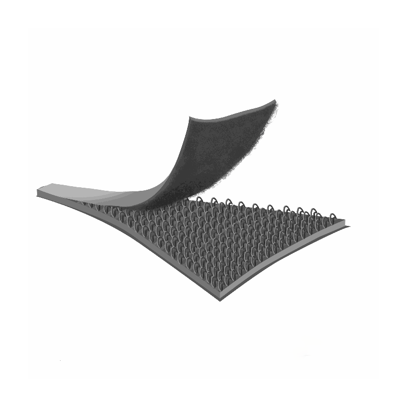 Sistema de fecho autoadesivo composto por um suporte de 70% nylon e 30% PET extrudido com acabamento em resina sintética, revestido com adesivo acrílico à base de solvente e protegido por um liner de papel siliconado branco.